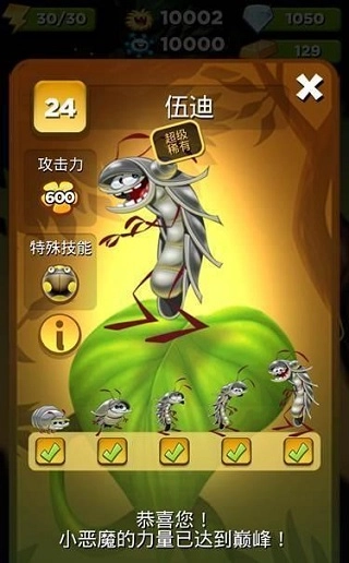 独特能力:金色瓢虫,初始阶段每回合能把1个方块转化为金色;当把小怪兽提升至满级后,每回合就能将5个方块变为金色。
