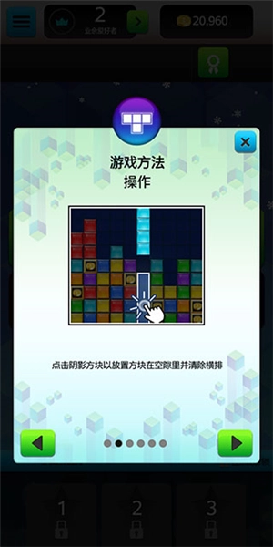 操作:点击阴影方块以放置方块在空隙里并清除横排。