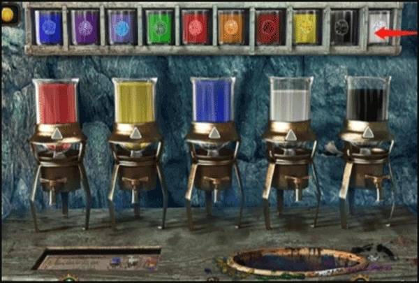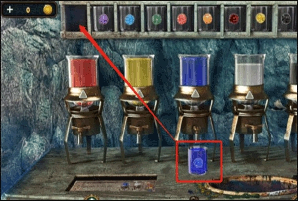 第一个烧瓶要调成蓝色,由于蓝色颜料原本就有,所以只需在蓝色颜料瓶下方转动两次按钮就行。调好颜色后,把这个烧瓶移回原位,接着再换另一个烧瓶。
