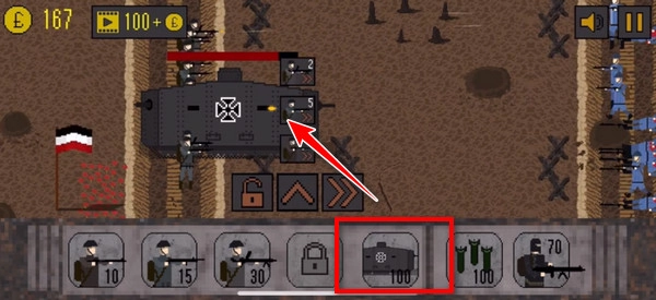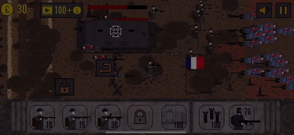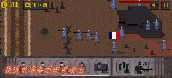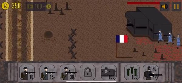 游戏正式开始后,你通过点击操作就能招募作战单位,地面标注的数值代表所需消耗的货币,到了游戏中后期还能解锁更强大的装甲载具,整个过程充满乐趣。