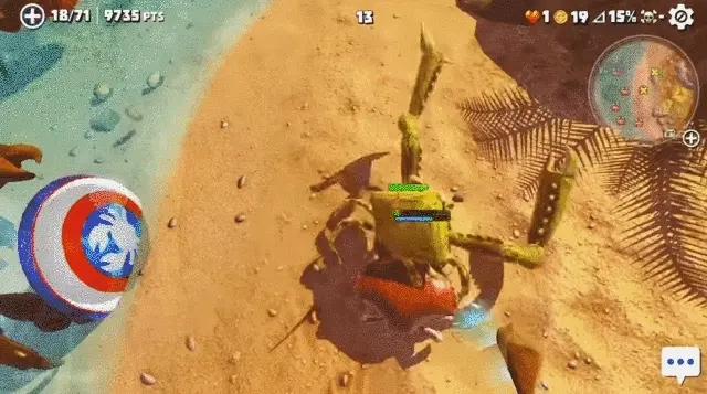 除了能徒手“吃掉对手”,我们还能在海岛上搜寻掉落的装备或箱子。打开这些箱子能找到武器,装备武器后可以提升螃蟹的攻击力与防御力。