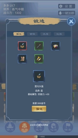开局先挂机看五次视频拿银币,用来锻造装备,之后再挂机一会儿领取灵玉。