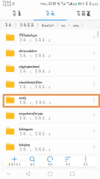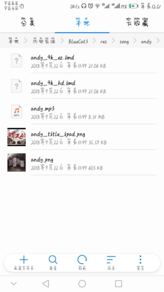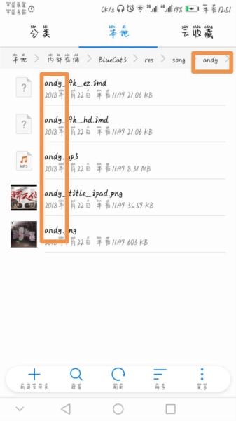 打开文件管理工具,定位到你下载好的自制谱文件。把它解压到bluecat3目录下song文件夹里的任意一个子文件夹就行,比如我自己就选了andy这个文件夹来存放解压后的内容。