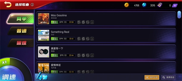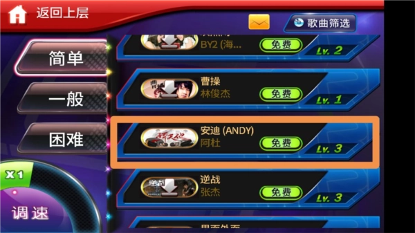 每个玩法模式下都设有三个难度层级的关卡,同时支持在1至8级的速度区间内调整歌曲节奏快慢。若想体验常规难度的歌曲,需要在基础模式中达到A级表现;而解锁高难度歌曲,则要求在基础和常规两个模式下都获得A级评价。