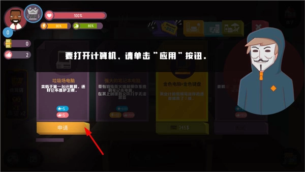 玩家接下来需要操作电脑编写一份申请程序,完成后将其出售,这样就能获取启动所需的第一笔资金。