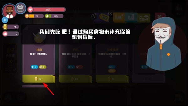 游戏上线后,为了维持玩家的体力与能量状态,需进入商店界面,找到餐饮分类,使用此前通过售卖程序赚取的资金购买食物来补充能量。
