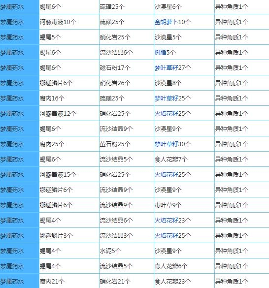 深渊药水的配方为:恶魔之翼8个、蓝铜粉17个、烁星果17个、凋零眼泪1个