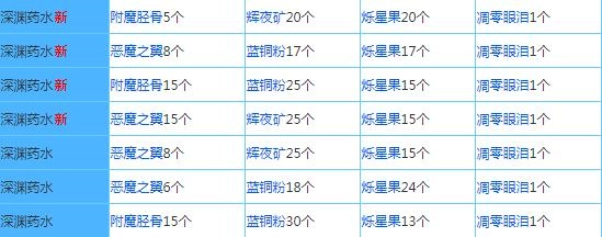 制作深渊相关的药剂,需要收集十五片恶魔之翼、二十五块辉夜矿石、十五颗烁星果实,以及一份凋零时产生的眼泪状材料。