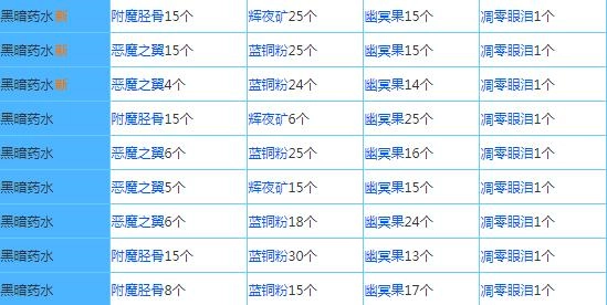 黑暗药剂的配方如下:需要4个恶魔之翼、24个蓝铜粉、14个幽冥果以及1个凋零眼泪。