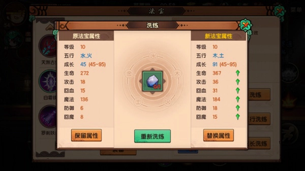 法宝的成长属性至关重要。不知道有没有人和我一样,之前炼制的法宝成长率都是45,其实很多人没意识到,45成长率的法宝和90以上成长率的相比,差距真的特别大。