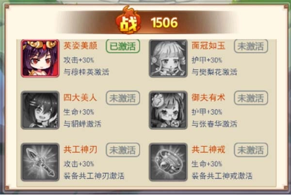 最后要提到的是武将羁绊,它主要分为两类:一类是闺中密友羁绊,另一类是情缘羁绊。这两种羁绊有个共同点——只要获取了对应的指定英雄,激活相应的羁绊就能得到属性方面的加成。不过它们也存在差异:闺中密友羁绊带来的属性加成是固定数值的;而情缘羁绊不仅能和特定装备形成额外羁绊效果,其本身提供的属性加成还都是百分比形式的。从这点就能看出,到了游戏中后期,情缘羁绊的作用会格外关键,但在前期阶段,闺中密友羁绊同样是不可或缺的。