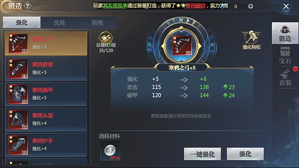一键强化功能会优先对强化等级最低的装备进行升级,直到所有强化材料都被消耗完毕为止。