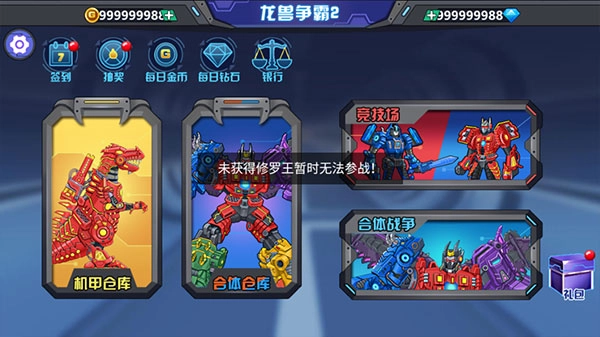 进入游戏后,我们能够点击机甲仓库,对恐龙进行升级与选择。