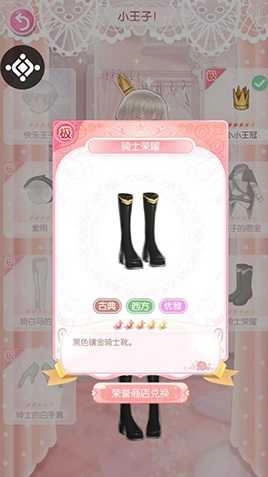 鞋子:骑士荣耀是一双充满西方特色的黑色骑士长靴,鞋身饰有精致的金色勾边,既优雅又帅气。虽说这双靴子似乎带有内增高的设计,但丝毫不减小王子的尊贵气质~想要获得它,可以前往荣誉商店进行兑换。