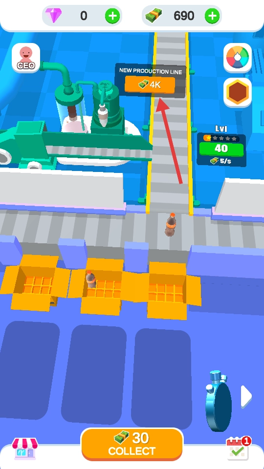 4、攒够钱时,点“NEWPRODUCTIONLINE(4K)”,升级产线,加快汽水产出。