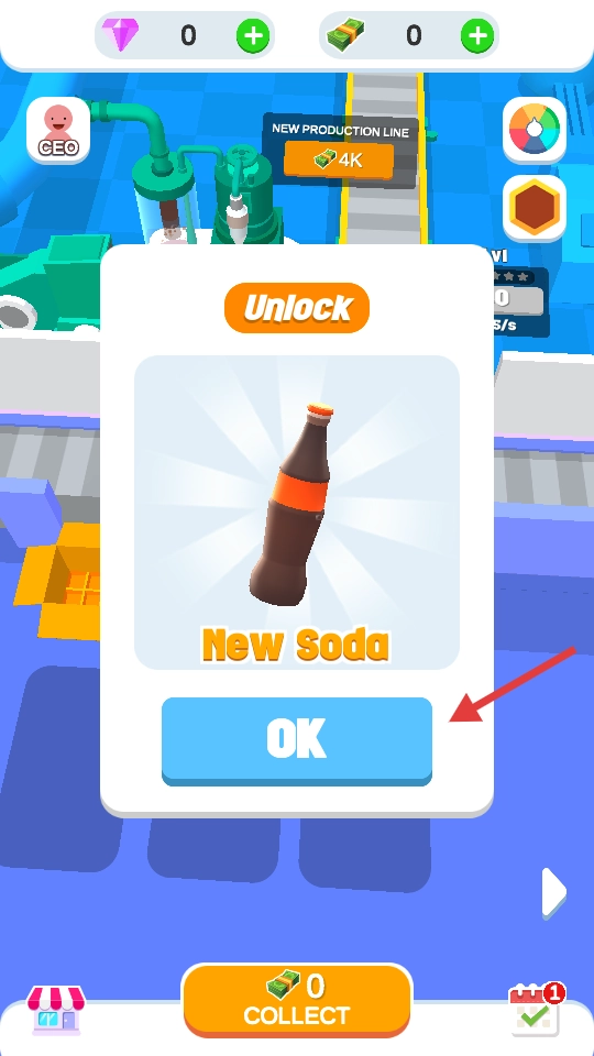 点击“OK”按钮,解锁全新汽水(NewSoda),启动生产流程,进入放置经营阶段。