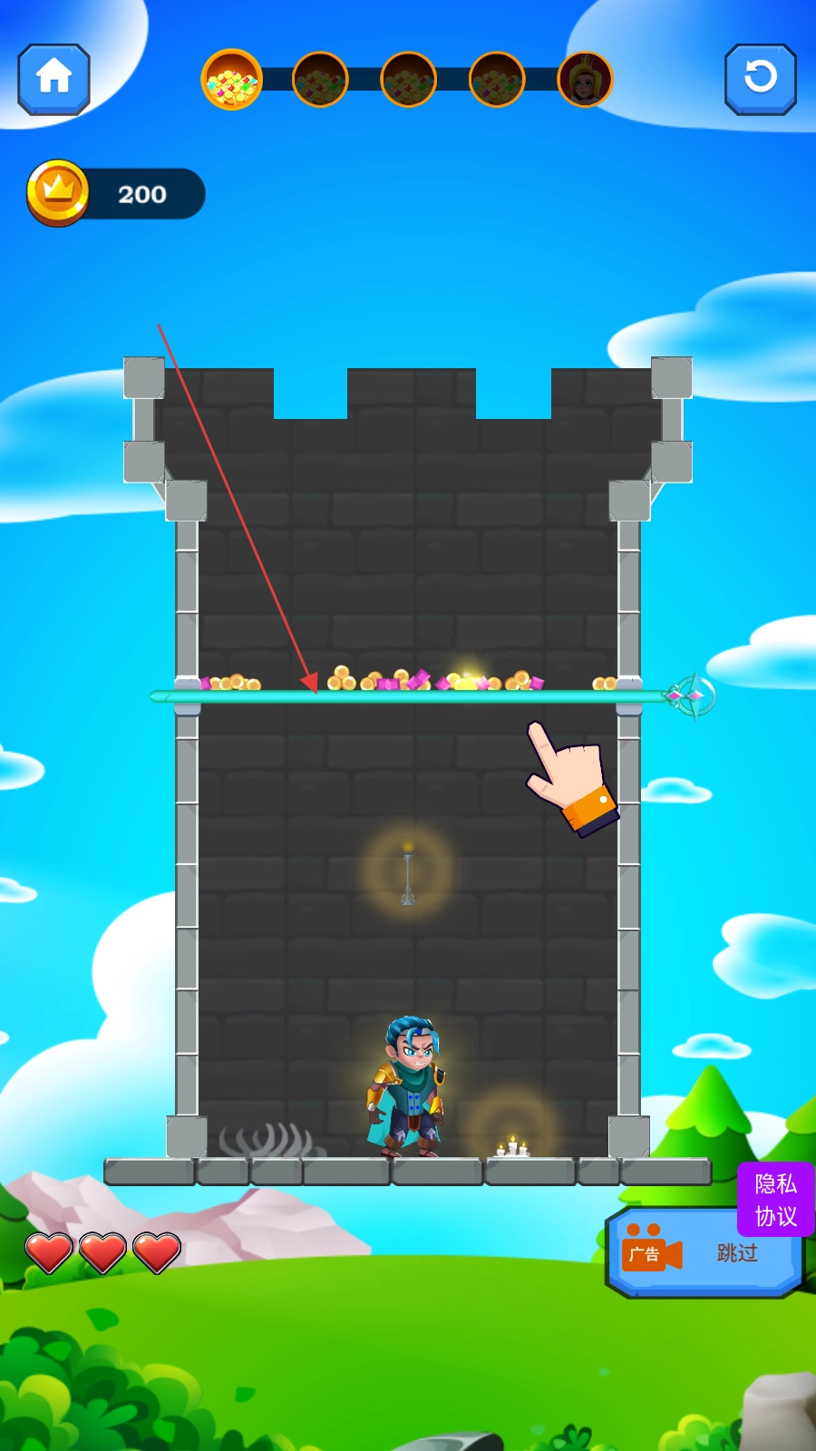 这是一款卡通画风的拉针解谜游戏,玩家的目标是在各式场景中救出被困的公主。每个关卡都布满了机关陷阱,需要谨慎规划抽针的顺序,才能避开危险完成救援,整个过程充满策略性与趣味性。作为一款益智闯关游戏,玩家将面对洪水、火焰、落石等多种挑战,还需与怪物周旋。通过巧妙地抽拉机关解谜,不仅能成功营救公主,还能解锁浪漫的故事线,成为独一无二的救援勇士。