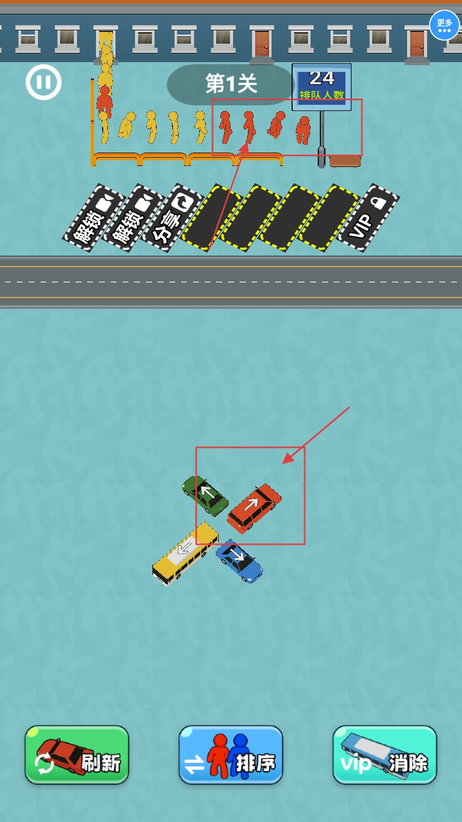 第1关依据排队人群的颜色,将对应颜色的车辆匹配至车位进行停靠。