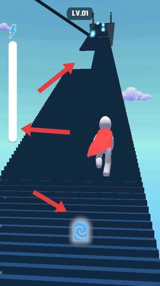 在游戏关卡的场景里,玩家需要控制角色沿着阶梯形状的路线行进,朝着指定的目标区域移动,过程中可以关注一下场景里的特殊标记之类的元素。