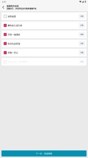 选好网文设定后,我们点击屏幕底部的“下一步,自选难度”按钮。