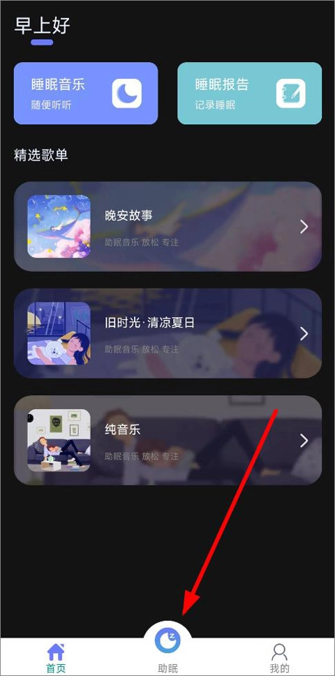打开睡眠记录后进入首页,这里设有睡眠音乐、睡眠报告、精选歌单等版块,接着点击助眠选项。