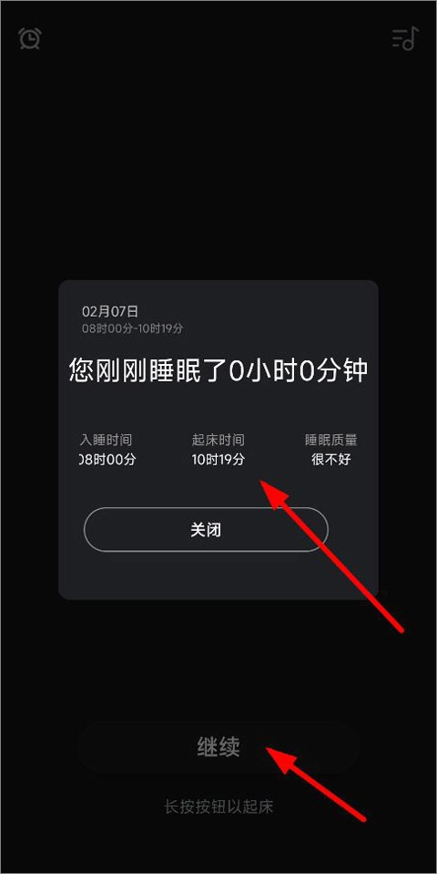 按住持续按钮稍作停留,就能看到入睡、起床的具体时刻,以及睡眠状况的好坏程度。