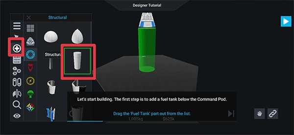 进入对应界面后,按照指引在指挥舱的下方位置添加一个燃料箱组件。找到带有加号标识的按钮并点击,随后在弹出的选项中选择structural类别。