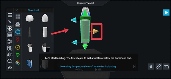 然后把它拖拽到指挥舱的下方,接着借助三角图标将燃料箱拉伸到绿色区域内。