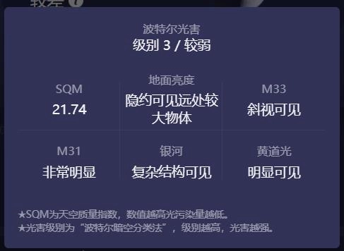 在图片的右上角,有一个胶囊样式的标识区域,这里展示着光污染的级别及相关概述,点击该区域即可获取更详细的信息。