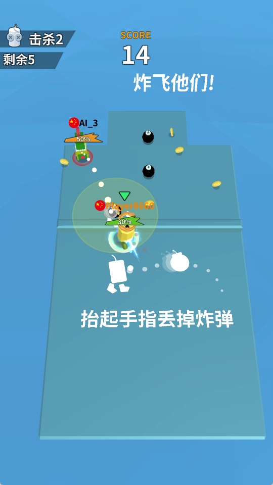 精准投掷:借助辅助虚线提前预判弹道轨迹,点击并松开手指即可投掷炸弹,实现对敌人的精准轰炸。