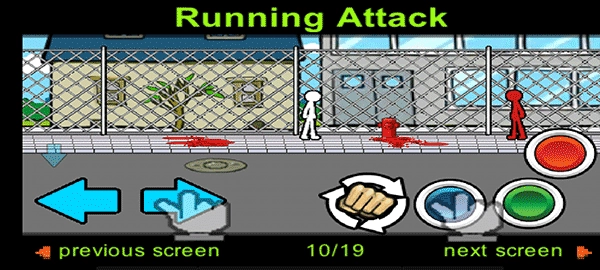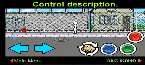 游戏界面左侧设有方向控制按钮,可用来操控火柴人移动;右侧则排列着转换武器、红色跳跃、蓝色攻击以及绿色拳打脚踢按钮,这些按钮承担着战斗操作的功能。