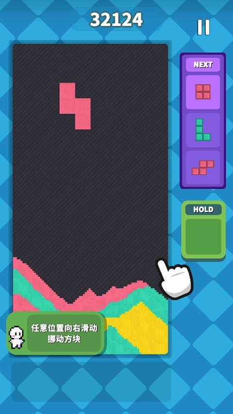 基本操作玩法:点击可旋转方块,向右滑动能挪动方块,快速下滑可让方块加速下落,还能依据预示的接下来三个方块的形状和颜色,提前做好规划与安置。