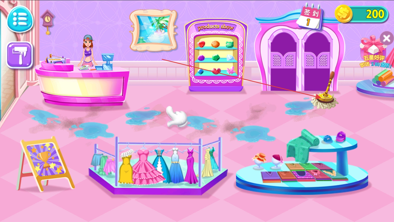 进入店内,按提示用拖把拖地清理污渍,整理店铺。