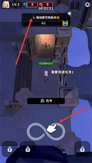 你可以通过拖动操作来控制角色四处移动,与此同时还得完成任务,要依照指引一步步推进游戏,达成各项任务的具体要求。