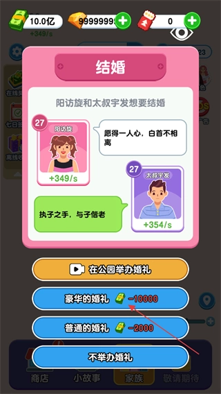 进入结婚界面后,要是确定要结婚,就能挑选豪华婚礼等不同级别的婚礼类型,并支付相应的费用。