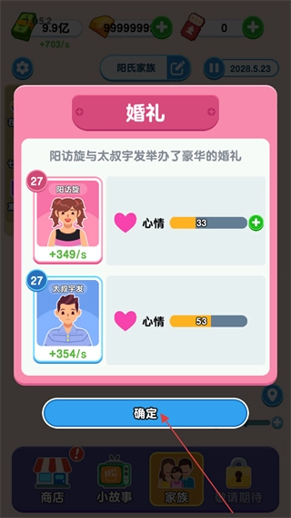 婚礼举办完成后,可在婚礼界面确认最终的婚礼结果,并查看双方心情等相关状态的变化情况。