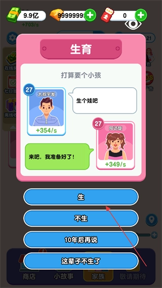 当生育选项出现时,可依据自身意愿点击“生”等相关按钮,以此来决定是否生育孩子。