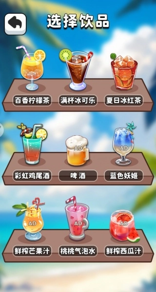 我开启了“饮料模拟器”模式,在这个模式下,游戏里有百香柠檬茶、满杯冰可乐等各式各样的饮品可供挑选。