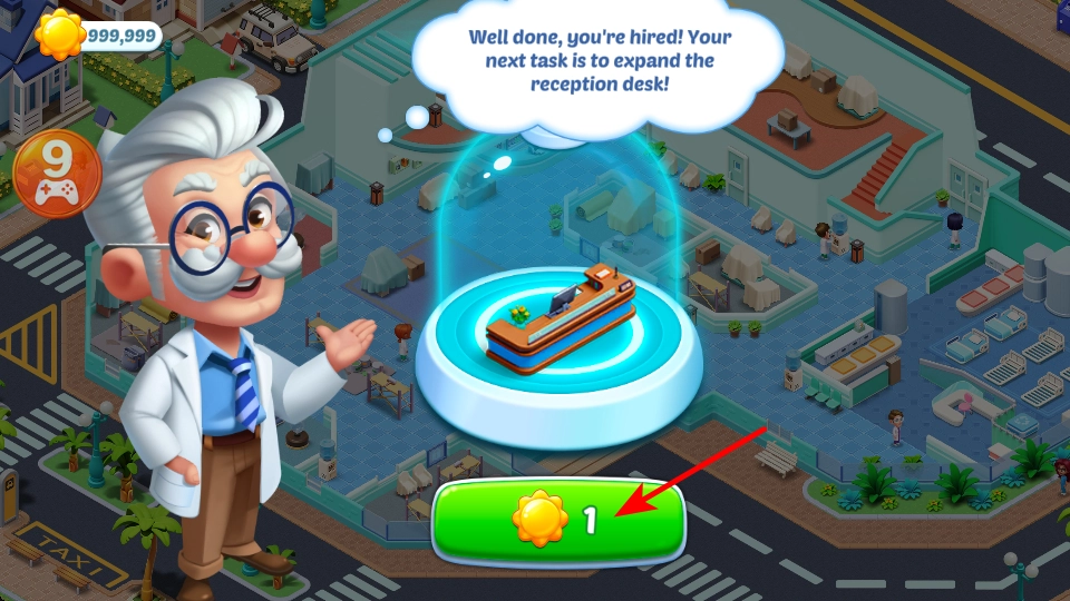 执行扩建操作,点击绿色按钮,消耗资源启动接待台扩建流程,增强医院的接待能力,加快医院建设进度。