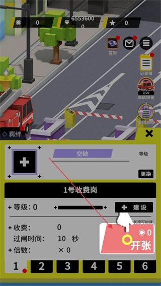 进入游戏后,先查看1号收费岗的相关信息,接着点击“开张”按钮来启动该收费岗的运营,此时收费岗的状态显示为空缺。