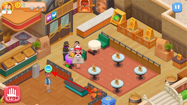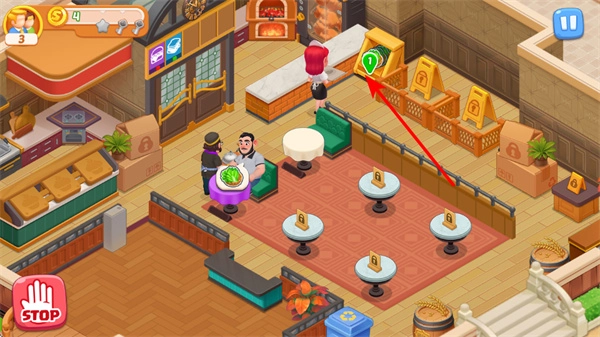 迎接新到店的顾客,留意门口的新顾客,点击他们头上的标识,引导顾客进入餐厅,以此增加客流量,进而提升收益。