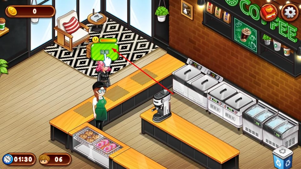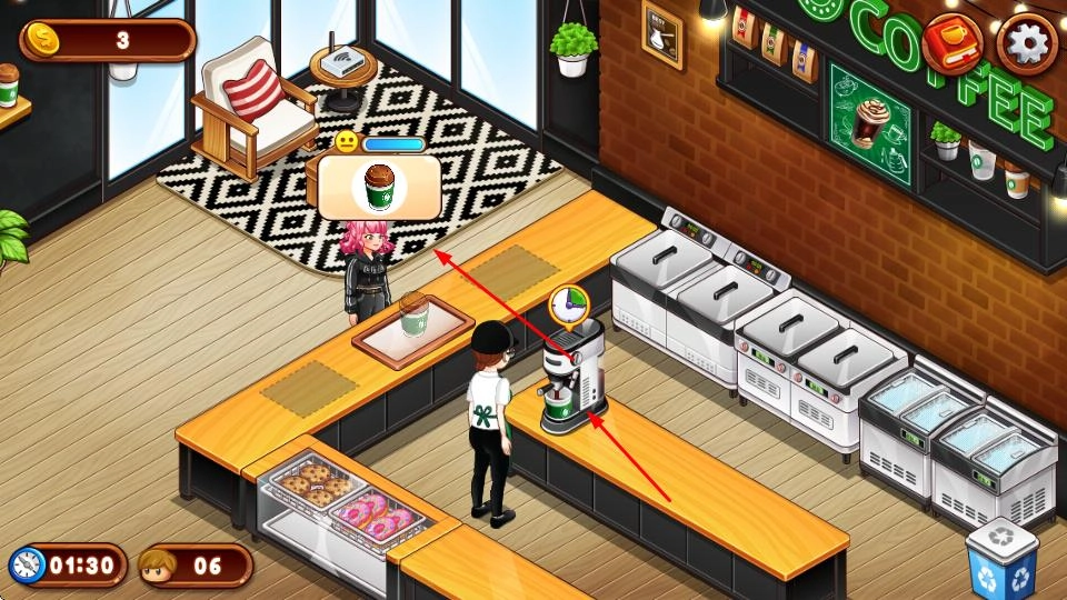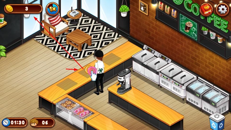把准备妥当的食物与饮料送到顾客那里,结束订单流程,领取金币之类的奖励,积攒资金来给咖啡店做升级。
