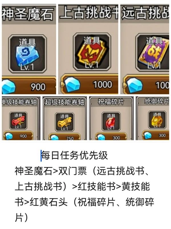 神圣魔石的优先级高于双门票(远古挑战书、上古挑战书),双门票高于红技能书,红技能书高于黄技能书,黄技能书高于红黄石头(祝福碎片、统御碎片)。