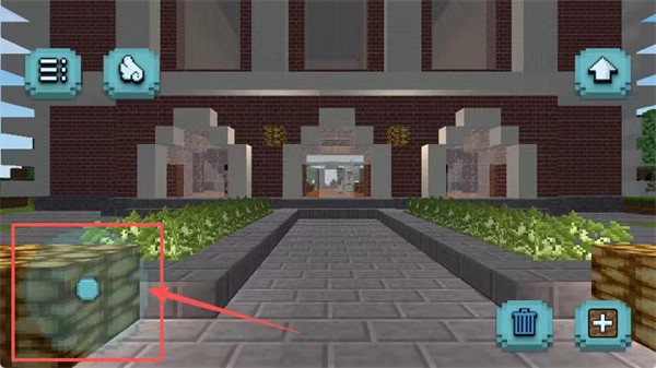 在像素风的建筑场景里,被红色箭头标记的绿色方块是可以进行操作的对象,左下角设有高亮的提示信息,而右上角的箭头或许是用来进入建筑内部的功能按钮。