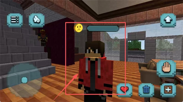 操作像素角色时,点击蓝色加号之类的图标来开展互动,上方的黄色表情条或许是生命值的象征,背景则是由石墙和木质地板组成的场景。