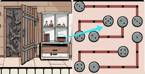 输入符号密码打开正大门右侧的柜子,接着点击右下方的红色盒子,完成盒上的连连看机关,就能取出里面的白色宝石。