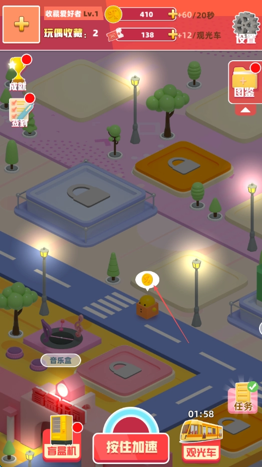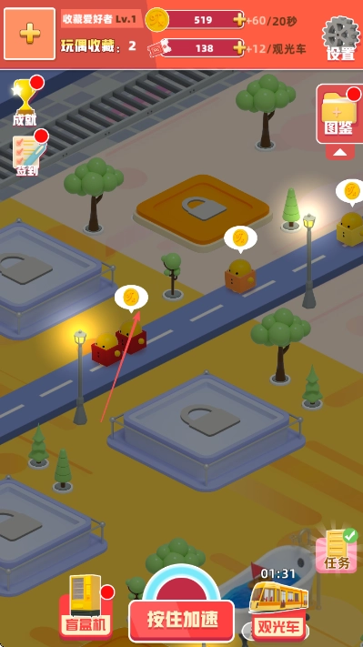 进入游戏界面后,留意左上角显示的收藏爱好者Lv.1等级以及金币等相关信息,通过点击并按住的操作来加速获取更多金币。