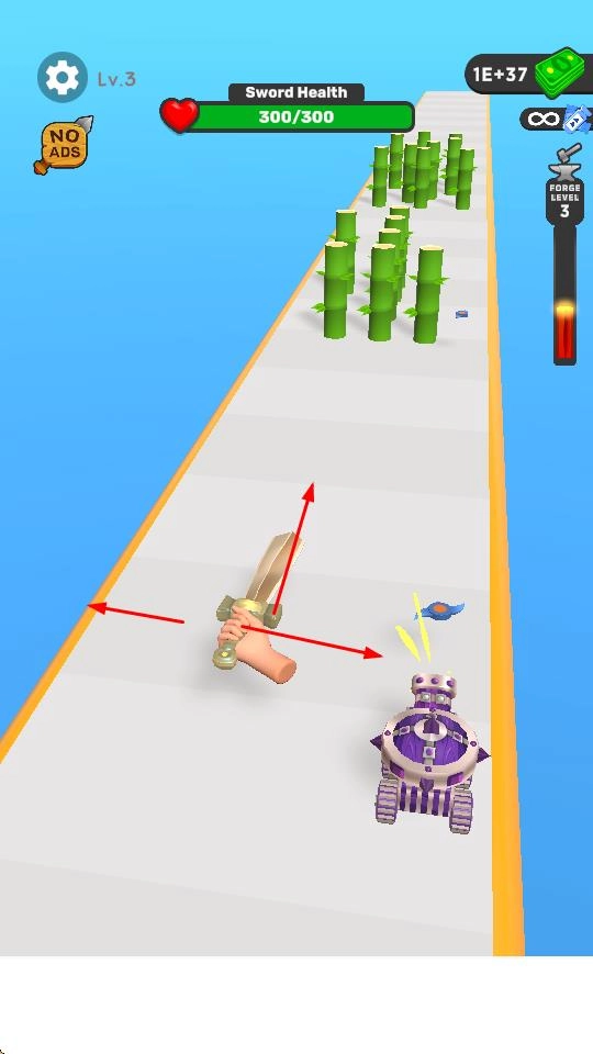 控制武器向前移动,当在跑道上碰到竹子之类的障碍物时,通过滑动屏幕调整武器方向来进行砍伐。