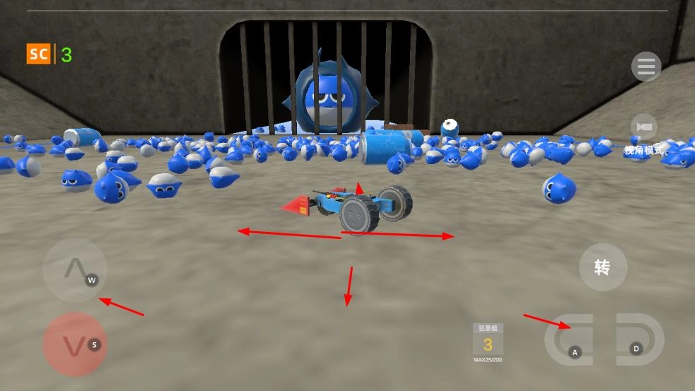 可以通过W、S、A、D等按键来操控车辆在场景里移动,让它穿梭在蓝色小怪物之间。