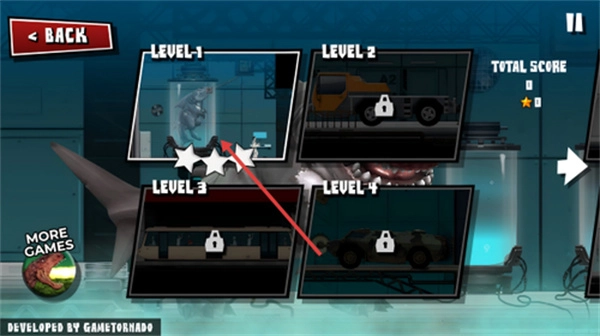 游戏开始后选择LEVEL1进入第一关,通过基础破坏玩法熟悉鲨鱼龙的移动与攻击操作。